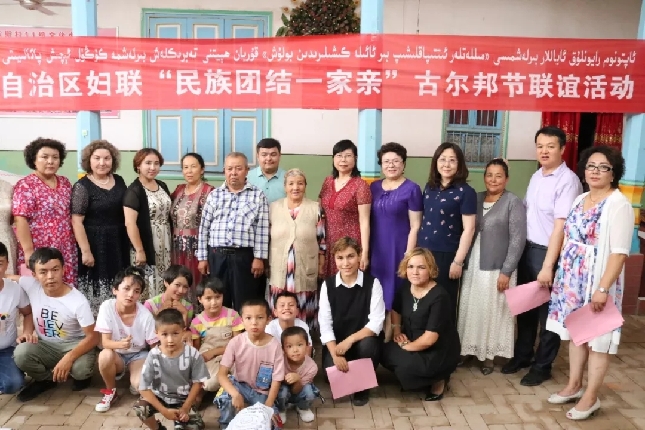 2019年8月11日是古尔邦节,自治区妇联驻群布斯村“访惠聚”工作队邀请亲戚们齐聚村11组文化大院,自治区妇联党组书记王丽霞带着妇联全体干部职工的问候,也来到村里与村民共同开展“民族团结一家亲”古尔邦节联谊活动。带着自己精心准备的礼物,王丽霞走进艾木拉汗·吾不力的家。78岁的艾木拉汗是贫困户,丈夫和女婿都去世了,她和女儿、孙子一起生活。一见面,王丽霞就拉着艾木拉汗老人的手,亲切的嘘寒问暖,并向老人送上了节日的祝福。