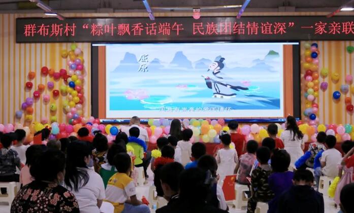 “端午节是中华民族的传统节日,相传楚国著名的爱国诗人屈原在农历五月初五这天自投于汨罗江,以身殉国,那些怀念屈原忠诚爱国的乡亲们为了保护他的遗体,纷纷把粽子投入江中……”村民们观看着大屏幕上端午节的来历,感受着屈原的爱国情怀,包着香甜可口的粽子,欣赏着自编自导的文艺节目,欢声笑语、其乐融融。