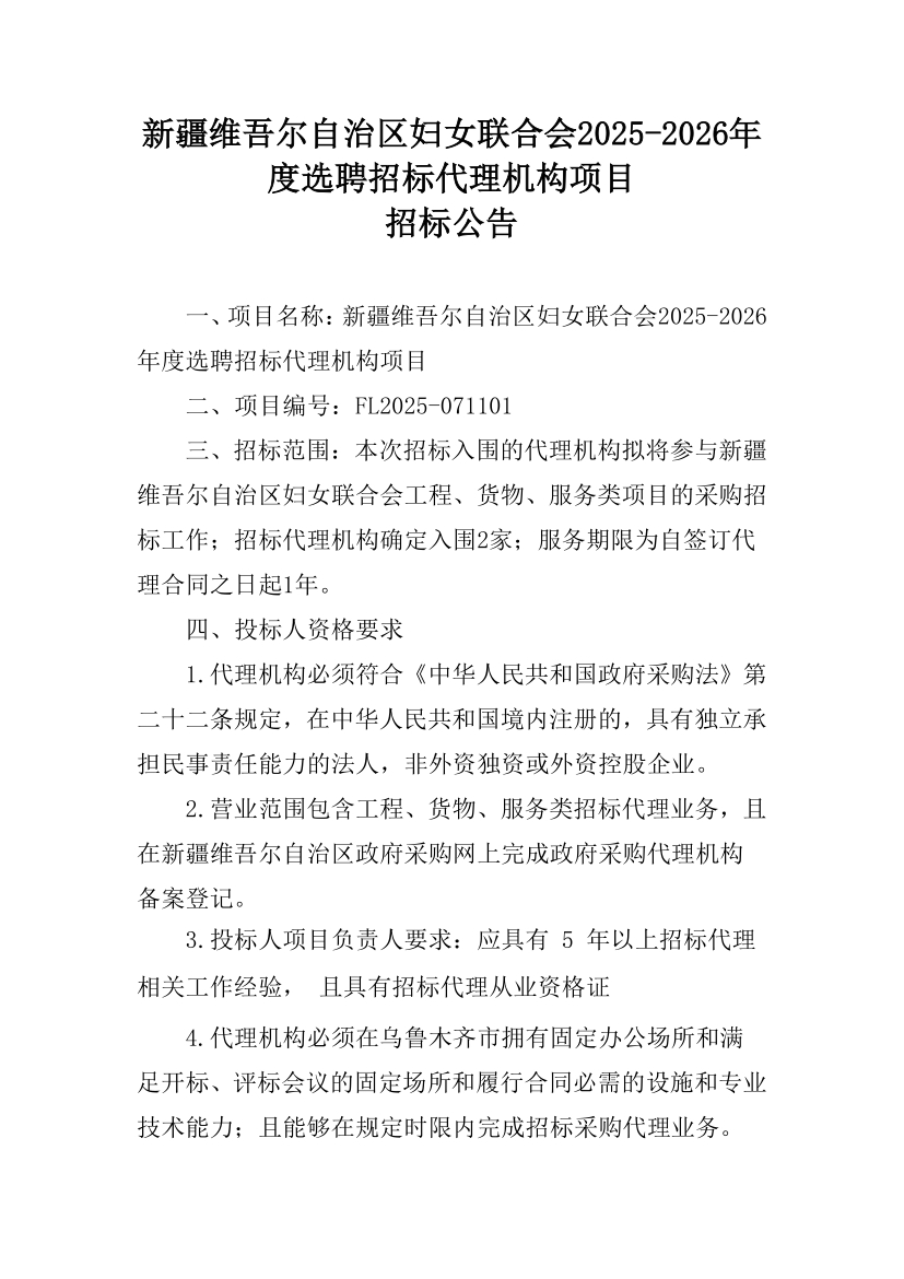 新疆维吾尔自治区妇女联合会2025-2026年度选聘招标代理机构项目招标公告